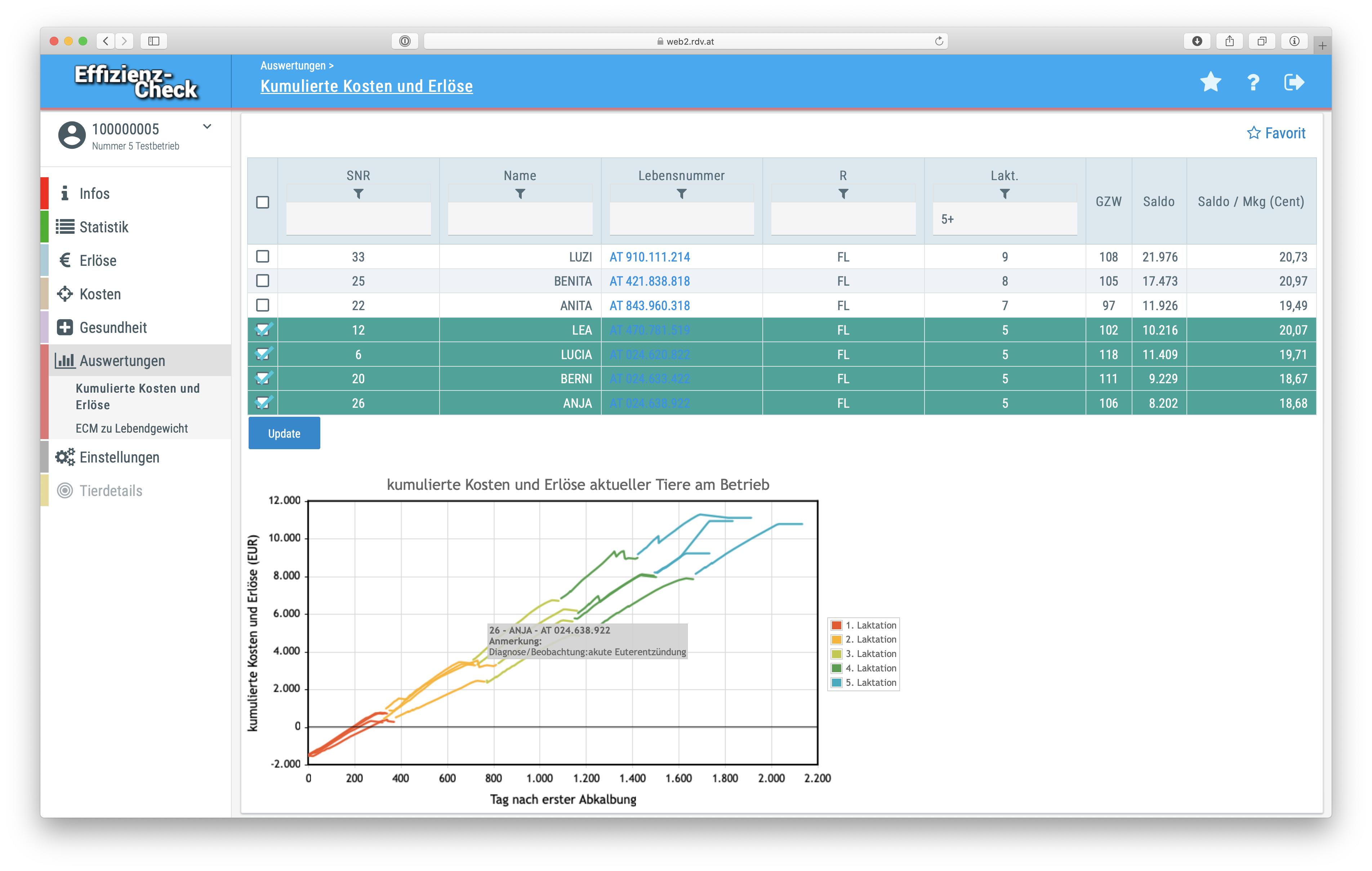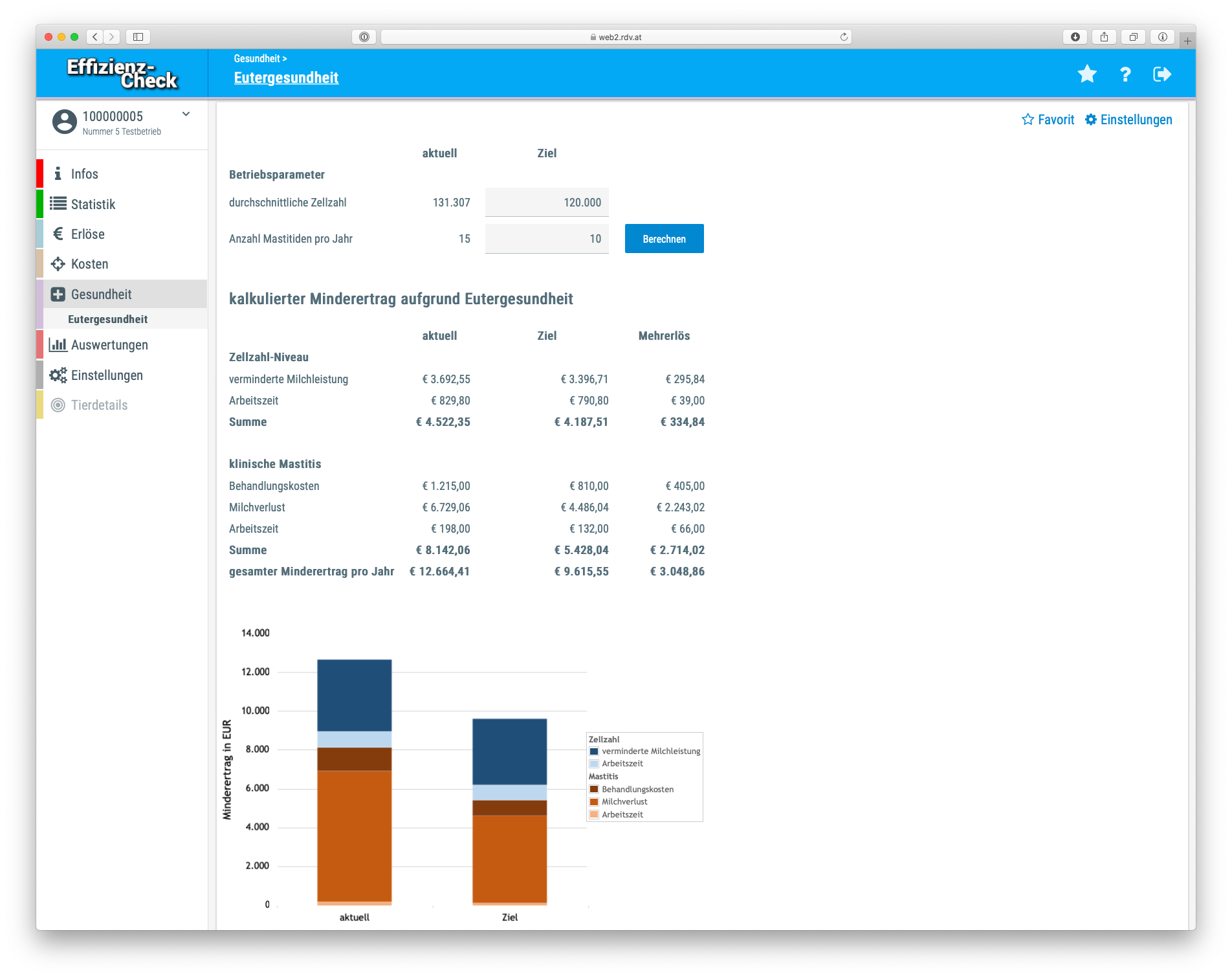 Im Rahmen des EIP-Projektes „Effizienz-Check“ wurde eine moderne und praxisgerechte Web-Anwendung entwickelt, die Milchbauern dabei unterstützt, gezielt Maßnahmen zur Verbesserung der ökonomischen als auch nährstoffbezogenen Effizienz in der Milchproduktion zu setzen. Durch die Visualisierung der Zusammenhänge von Managementmaßnahmen, Haltungsbedingungen, Tiergesundheit und Krankheiten und deren ökonomischen Auswirkungen soll das Bewusstsein der Betriebsleiter für Tierwohl und –gesundheit gestärkt werden.