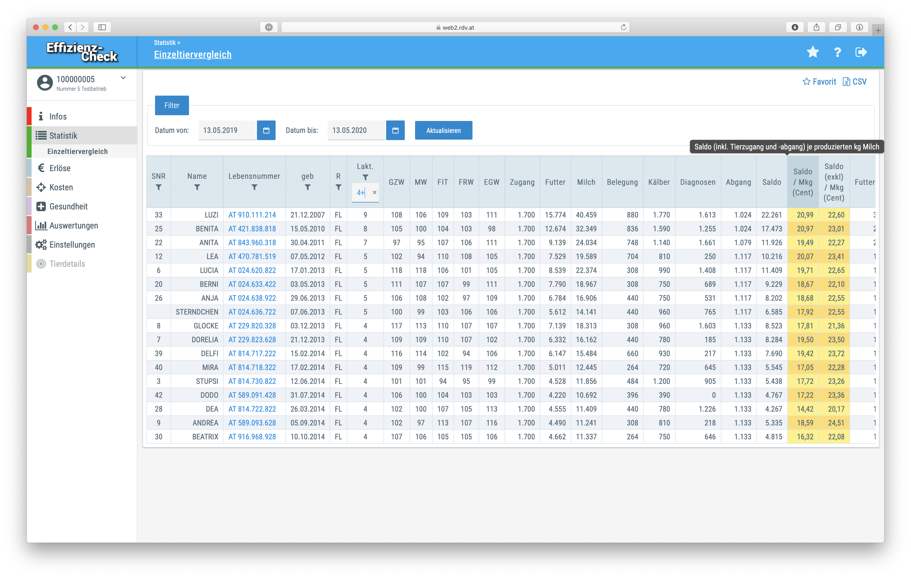 - Vergleich der Wirtschaftlichkeit aller Milchkühe am Betrieb unter Berücksichtigung von Erlösen aus Milch, Fleisch und Kälbern sowie Kosten aufgrund von Fütterung, Haltung, Fruchtbarkeit, Krankheiten und deren Folgen.