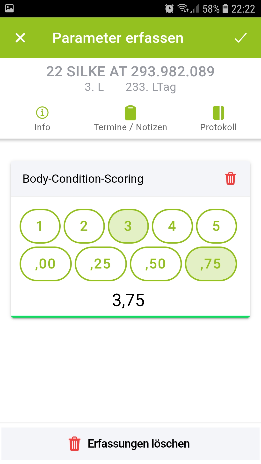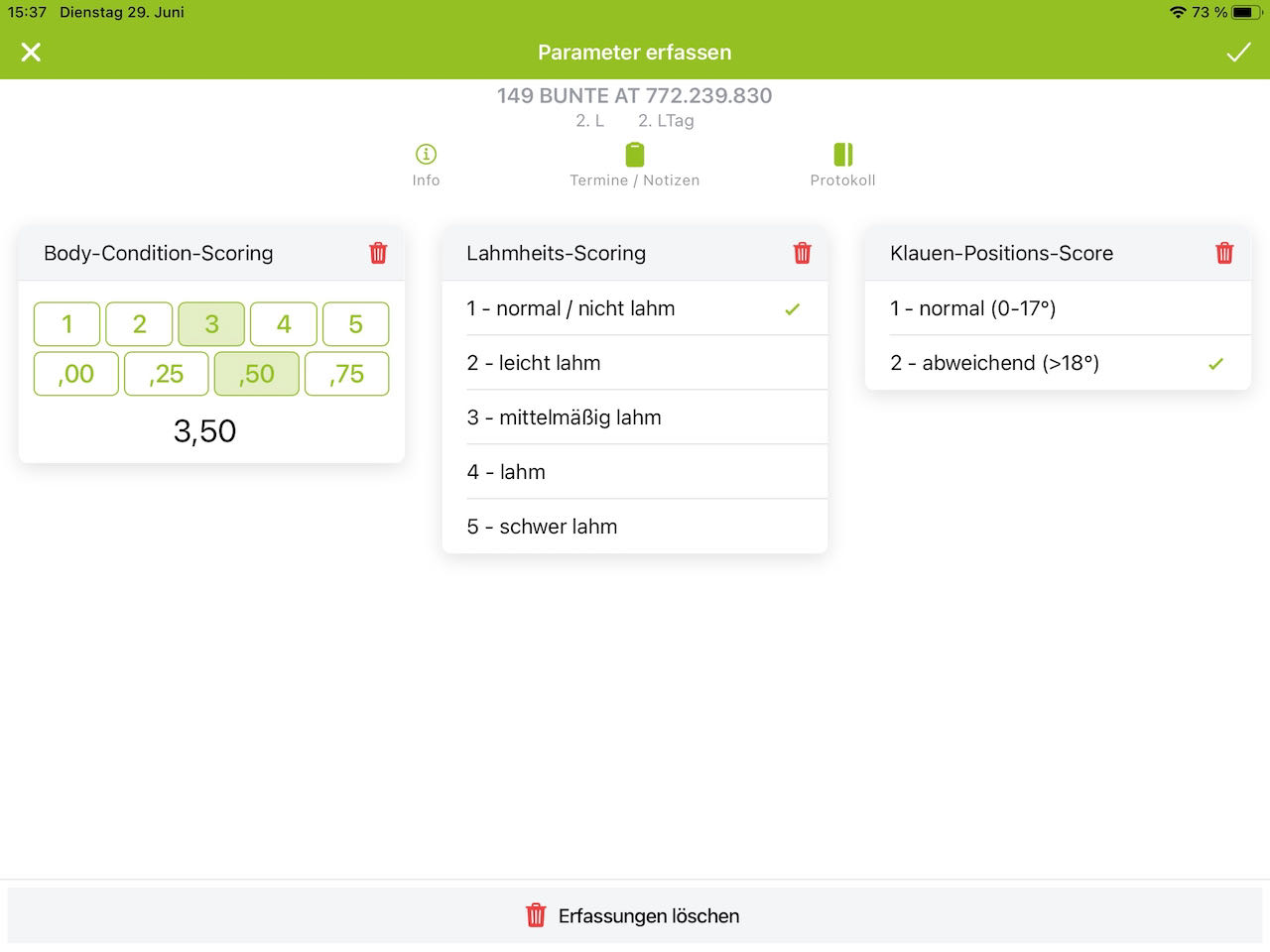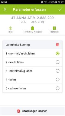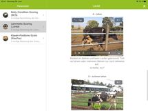 Zusätzlich zur Klauenpflege können sie unter dem Menüpunkt weitere Erfassungen wahlweise die Tiergesundheitsparameter Körperkondition (Body Condition Score - BCS), Lahmheiten (Locomotion Scoring nach Sprecher et al. 1977) und den Zwischenklauenwinkel (Klauen-Positions-Score) beurteilen und erfassen. Das Nachschlagwerk Weitere Parameter beschreibt die 3 Parameter anhand von Bild- und Videomaterial. Wie die Klauenbefunde finden sie auch diese Parameter in einem Protokoll und unter dem Punkt Auswertungen übersichtlich aufbereitet.