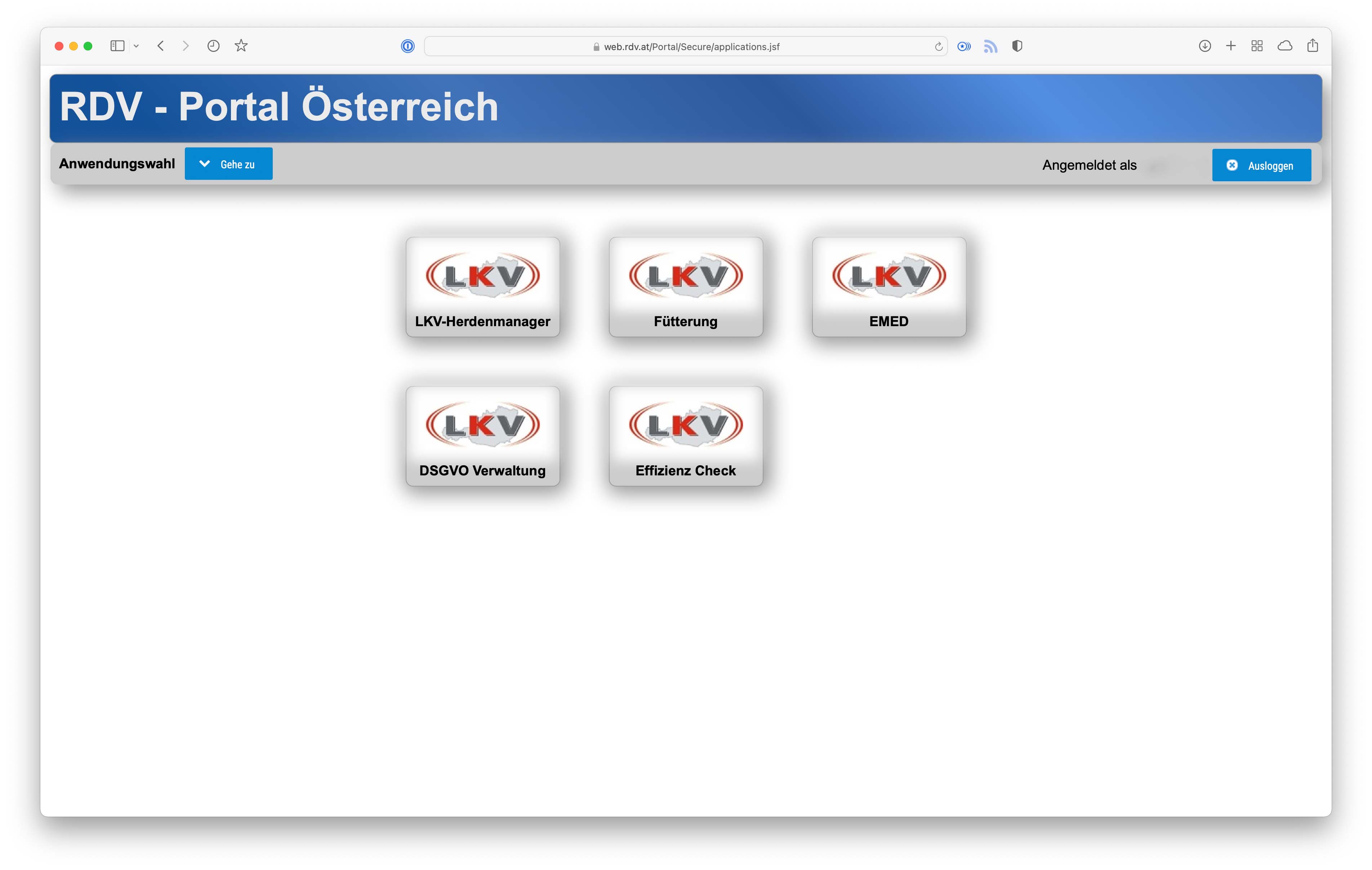 Nach dem Login werden alle Anwendungen angezeigt, für die man durch den zuständigen Zucht- bzw. Kontrollverband freigeschaltet wurde.