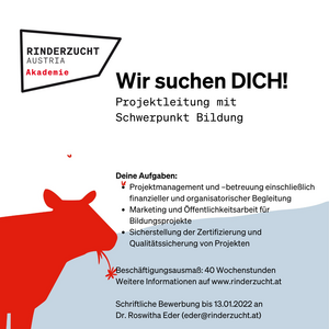 - Ausbildung an einer höheren landwirtschaftlichen Bundeslehranstalt mit Maturaabschluss oder Studium der Fachrichtung Landwirtschaft mit praktischem Bezug zur Landwirtschaft -bestenfalls zur Rinderzucht