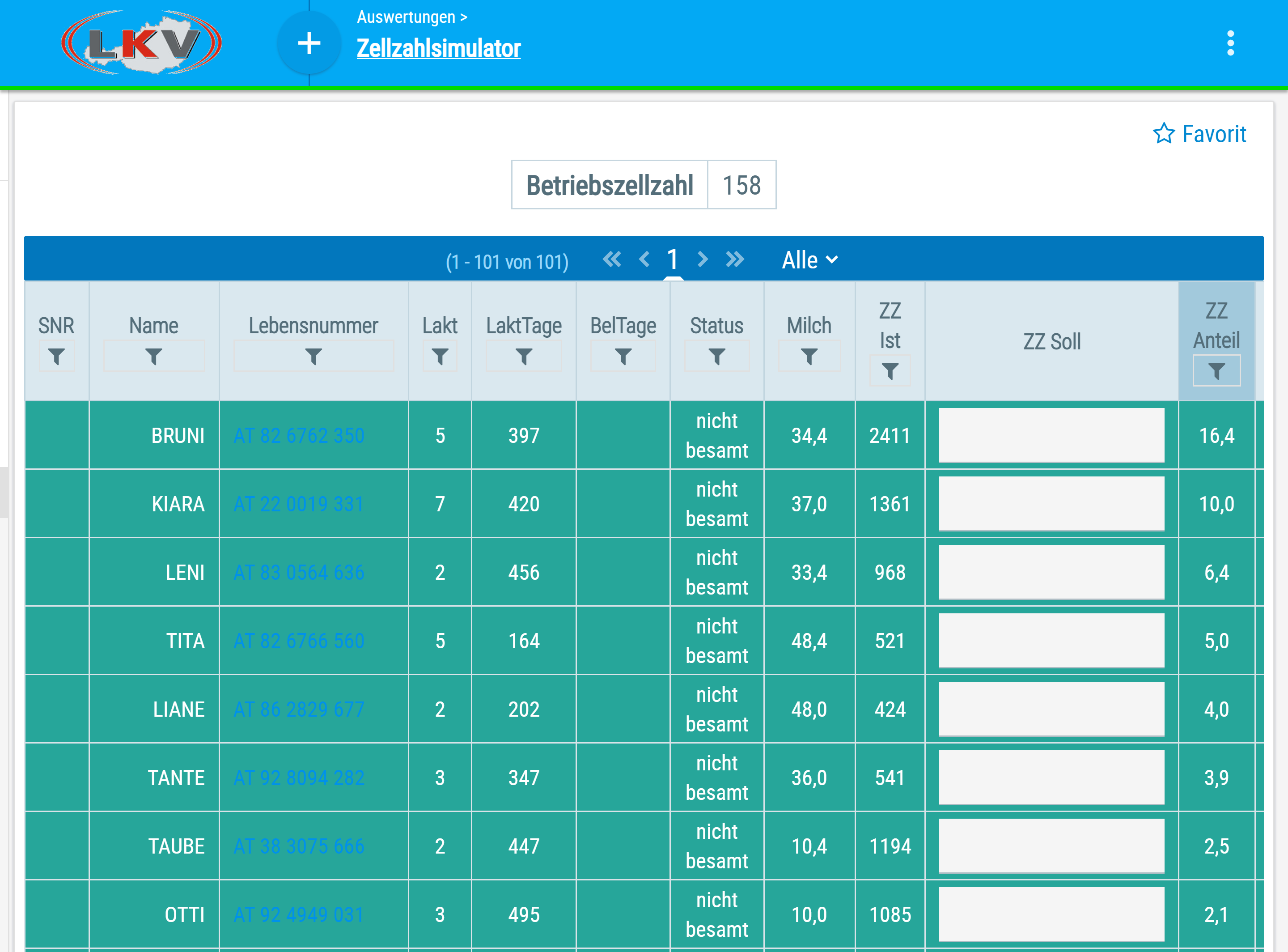 Welche Kuh hat welchen Beitrag zur betrieblichen Gesamtzellzahl? Simulieren Sie den Effekt, wenn ein oder mehrere Kühe mit hoher Zellzahl nicht mehr in den Tank gemolken werden.