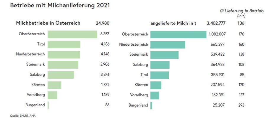 Im Jahr 2021 haben 24.980 österreichische Betriebe Milch an Molkereien oder sonstige Aufkäufer geliefert, das ist ein Rückgang von 982 Betrieben bzw. -3,4% im Vergleich zu 2020. In allen Bundesländern kam es zu einem Rückgang der Betriebe, am höchsten war dieser in Niederösterreich mit -5,7%, gefolgt vom Burgenland mit -5,5%, am geringsten war er mit -1,6% in Tirol. Die Milchanlieferung österreichischer Betriebe betrug im Jahr 2021 in Summe 3,403 Mio. Tonnen, im Vergleich zum Vorjahr ist das eine geringfügige Steigerung von 18.365 t bzw. 0,5%. Während die Bundesländer Kärnten, Niederösterreich, Salzburg, Steiermark, Tirol und Vorarlberg die Anlieferung steigern konnten, ging sie in den Bundesländern Burgenland und Oberösterreich zurück, wobei Oberösterreich mit -1,0% bzw. rund 11.200 t den höchsten Rückgang verzeichnete. Die durchschnittliche Anlieferung je Betrieb stieg im Jahr 2021 von 131.000 kg (2020) auf 136.000 kg (+4,1%). Nach Bundesländern differenziert erreichte die höchste Anlieferung je Betrieb das Burgenland mit rund 293.000 kg, die niedrigste das Bundesland Tirol mit rund 85.000 kg. Von den 3,403 Mio. Tonnen wurden 249.000 t bzw. 7% der angelieferten Milch an ausländische Verarbeitungsbetriebe verkauft.