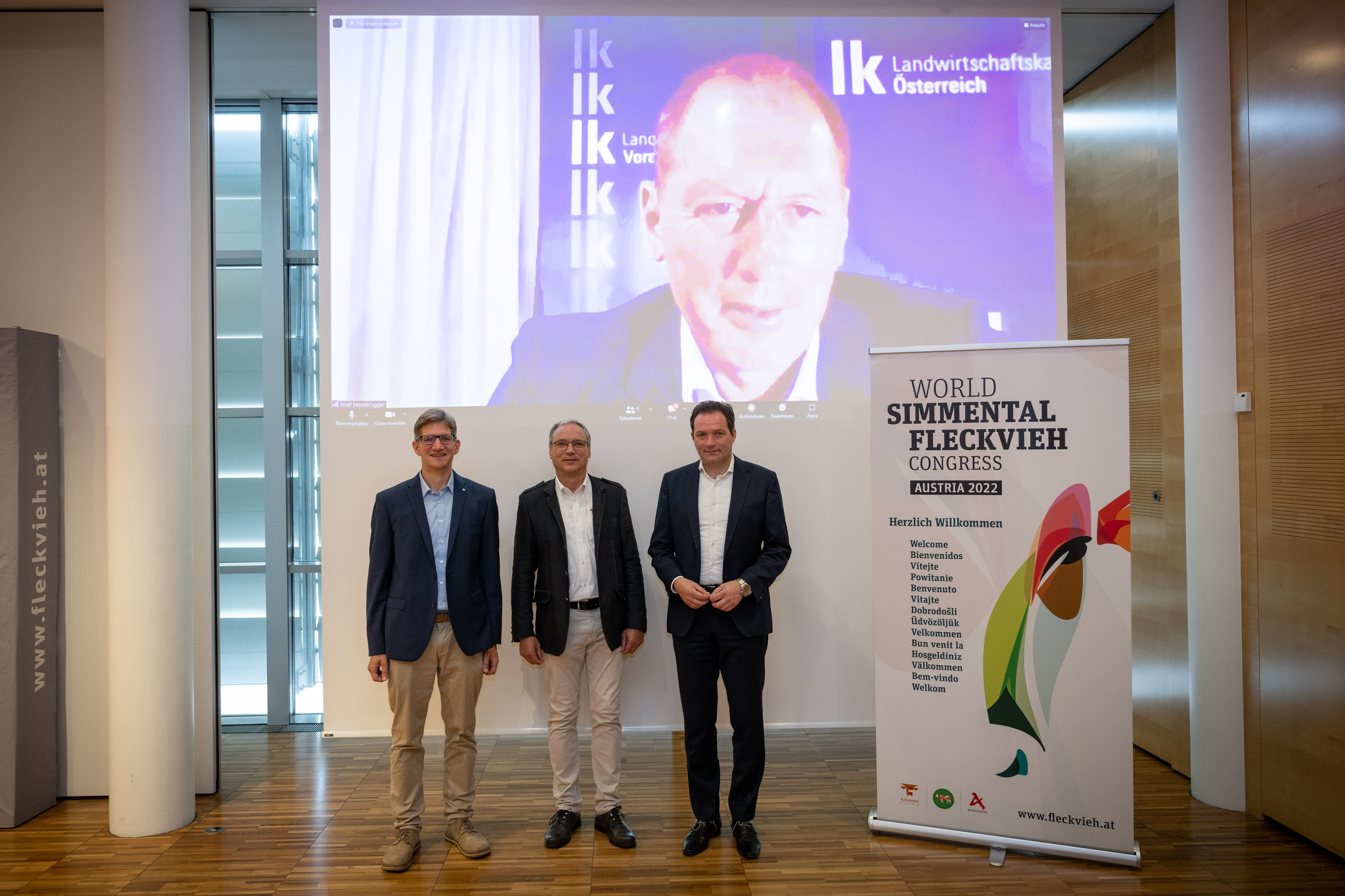 Nach mehr als 25 Jahren findet der Fleckvieh-Weltkongress wieder in Österreich statt. Zwischen 30. August und 8. September reisen dazu über 220 Rinderexpertinnen und -experten aus 30 Ländern an. Unter dem Motto „Fleckvieh Changes“ werden die ökologischen, wie auch ökonomischen Qualitäten dieser Rinderrasse, die für Nachhaltigkeit, Effizienz und Robustheit steht, umfassend erläutert. Im Vorfeld zum Fleckvieh-Kongress haben Landwirtschaftsminister Norbert Totschnig, LKÖ-Präsident Josef Moosbrugger, der Obmann von Fleckvieh Austria Sebastian Auernig und BOKU-Experte Stefan Hörtenhuber in einer gemeinsamen Pressekonferenz die Situation der heimischen Fleckvieh-Zucht skizziert.