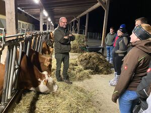 Um die Besonderheiten der Kärntner Rinderzucht kennenzulernen, stand am Abend der Besuch des Schulbetriebs der LFS Althofen "Gut Weindorf" am Programm. Reinfried Kraxner führte die Gruppe durch den Schulbetrieb und stellte auch die nahe dem Schulstall untergebrachten Jungstiere vor. Ein Merkmal ist die Spezialisierung auf Mutterkuhhaltung und der Vergleich der Fleischrassen (Fleckvieh, Charolais und Limousin), die der Situation der Kärntner Rinderhalter:innen entsprechen. Damit ist die LFS Althofen das Mutterkuhzentrum in Kärnten.