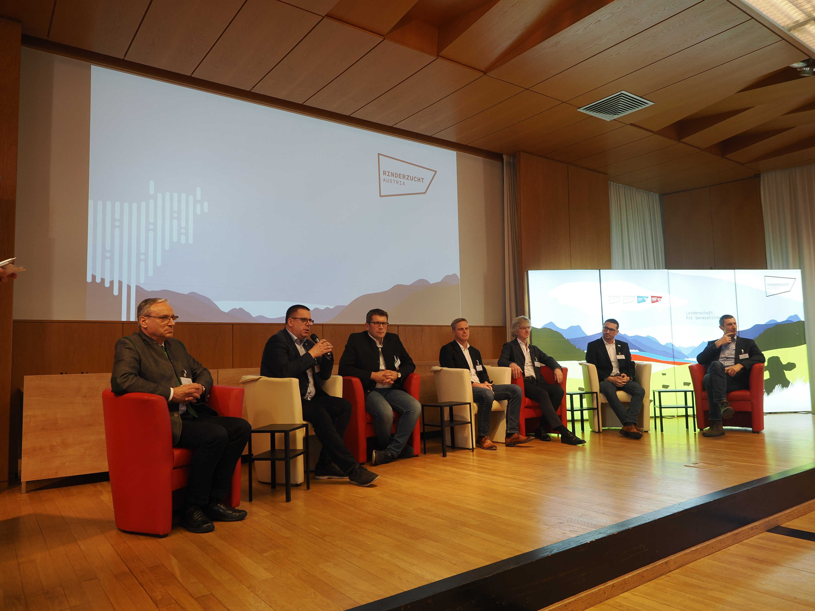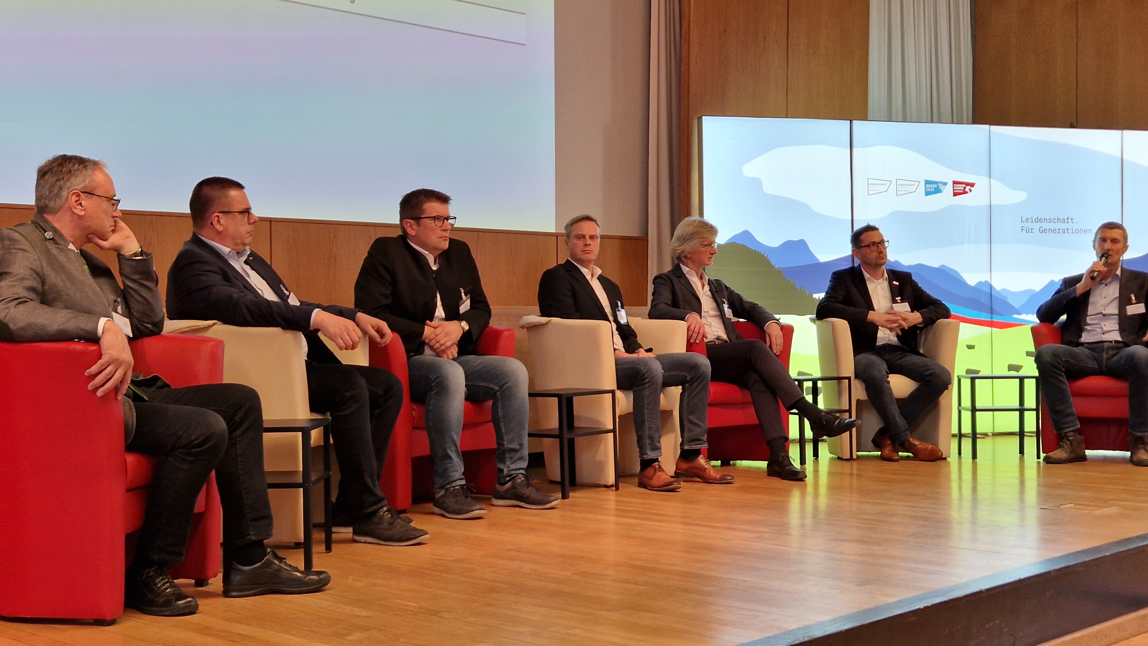 In der abschließend hochkarätig besetzten Diskussion mit Obmann Ing. Sebastian Auernig, Martin Huber (Österreich-Chef von DeLaval), Ing. Andreas Feichtlbauer (Geschäftsführer von Lely Österreich), Geschäftsführer Ing. Franz Wasserbauer, Dr. Christian Helfert von MSD, Michael Wurzer von GEA Österreich und Geschäftsführer von LKV Austria, DI Markus Koblmüller, wurden unter der Moderation von RINDERZUCHT AUSTRIA Geschäftsführer Martin Stegfellner die aktuell zu erwartenden technischen und auch strukturellen Entwicklungen vorgestellt und diskutiert. Die Geschwindigkeit der Digitalisierung ist für alle Landtechnikfirmen und natürlich die Landeskontrollverbände (LKV) eine große Herausforderung. Dazu kommen verschiedenste gesellschaftliche Diskussionen, die Druck auf die bäuerliche Landwirtschaft ausüben. Grundsätzlich kann man nur gemeinsam in der relativ kleinen landwirtschaftlichen „Bubble“ überleben. Eine konstruktive Zusammenarbeit aller beteiligten Verbände und Firmen ist daher unabdingbar. Durch Früherkennung etwaiger Probleme der Tiergesundheit mit Hilfe von verschiedenen Systemen und Sensoren kann zielgerichteter in Zusammenarbeit mit den Tierärzt:innen auf etwaige Probleme zeitnah reagiert oder nach erfolgten Maßnahmen kontrolliert werden, ob die ergriffenen Maßnahmen auch tatsächlich zum Erfolg geführt haben. Die Rinderbetriebe gehen seit Jahren um rund 2 % jährlich zurück, die Kuhzahlen bleiben zuletzt konstant auf hohem Niveau. Die Technisierung auf den Betrieben liegt bei ca. 20 %. Ziel soll es sein, die bestehenden Daten erst einmal bestmöglich zu nutzen und erst dann weitere Parameter in die Verarbeitung aufzunehmen. Wichtig sei auf jeden Fall, das all diese Daten in bäuerlicher Hand bleiben sollen bzw. müssen, um nicht von internationalen Konzernen in Abhängigkeit zu geraten. Ein enormes Potential sehen die Zuchtverantwortlichen auch in der Vermessung der Euter, die ja ohnedies von den AMS-Sensoren gescannt werden, sowie in der Möglichkeit, die Tiere bei jeder Melkung zu wiegen. Die Daten wären lt. Melktechnikfirmen vorhanden, müssten aber entsprechend aufbereitet und über weitere Schnittstellen für eine Nutzung verarbeitet werden. Alle Experten dieser Diskussionsrunde waren der Meinung, dass die Automatisierung sehr schnell an ihre Genzen stößt. Der Faktor Mensch wird auch in Zukunft die wichtigste Rolle beibehalten.