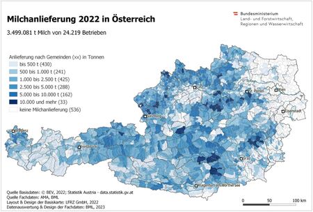 Laut der Agrarmarkt Austria (AMA) gibt es 2022 in Österreich 23.178 Milchbetriebe mit Milchanlieferung, wobei darin ausschließlich jene Betriebe erfasst sind, die im Dezember 2022 Milch an einen Verarbeitungsbetrieb geliefert haben. Der Unterschied zu den eingangs angeführten 24.219 Betrieben ergibt sich einerseits aufgrund von Betrieben, die ausschließlich Almmilch liefern, andererseits gibt es viele Betriebe, die schon während des Jahres die Milchproduktion eingestellt haben. Weiters gibt es auch Betriebe mit saisonaler Abkalbung, die im Dezember eine Melkpause einlegen. 11.562 Betriebe, die im Jahr 2022 mehr als 100.000 kg Milch produzierten, sind für 82 % der Milchanlieferung verantwortlich. Darunter waren 865 Betriebe, die mehr als 500.000 kg Milch lieferten und davon wiederum lieferten 71 Betriebe mehr als 1.000.000 kg. Von den Betrieben, die mehr als 1.000.000 kg Milch ablieferten, lagen 28 Betriebe in Oberösterreich, 12 in Niederösterreich und 11 in der Steiermark. In allen Bundesländern mit Milchablieferung gibt es Betriebe dieser Größenordnung. Von den rund 20.570 Betrieben mit naturbedingten Nachteilen sind 2,819 Mio. t angeliefert worden. Diese Gruppe macht 85 % aller Milchbetriebe und 81 % der angelieferten Milch aus. Mit Ausnahme der Erschwernispunktegruppe 4 verzeichneten die drei anderen Erschwernispunktegruppen gegenüber 2021 eine Steigerung bei der angelieferten Milch. 90 % der Milch in Österreich wird im benachteiligten Gebiet produziert. Angelieferte Milch nach Gemeinden Die Karte gibt einen Überblick zur Milchanlieferung nach Gemeinden in Österreich. 2022 wird in 1.580 Gemeinden Milch an Verarbeitungsbetriebe geliefert, aber allein in 250 Gemeinden wird die Hälfte der Milchmenge in Österreich produziert, 104 davon liegen in Oberösterreich. In 33 Gemeinden liegt die Milchproduktion über 10.000 t, vor zehn Jahren waren es 15 Gemeinden. Unter den Top 10‐Gemeinden mit Betrieben mit Milchanlieferung sind 2022 folgende Änderungen gegenüber 2021 festzuhalten: Seekirchen am Wallersee bleibt an die Spitze und hat gegenüber 2021 bei der Milchanlieferung stark zugelegt. Purgstall an der Erlauf liegt jetzt vor Hofstetten‐Grünau. Weiters schaffte es Weißkirchen in der Steiermark in die Top 10, während Wolfsberg in Kärnten nicht mehr vertreten ist.