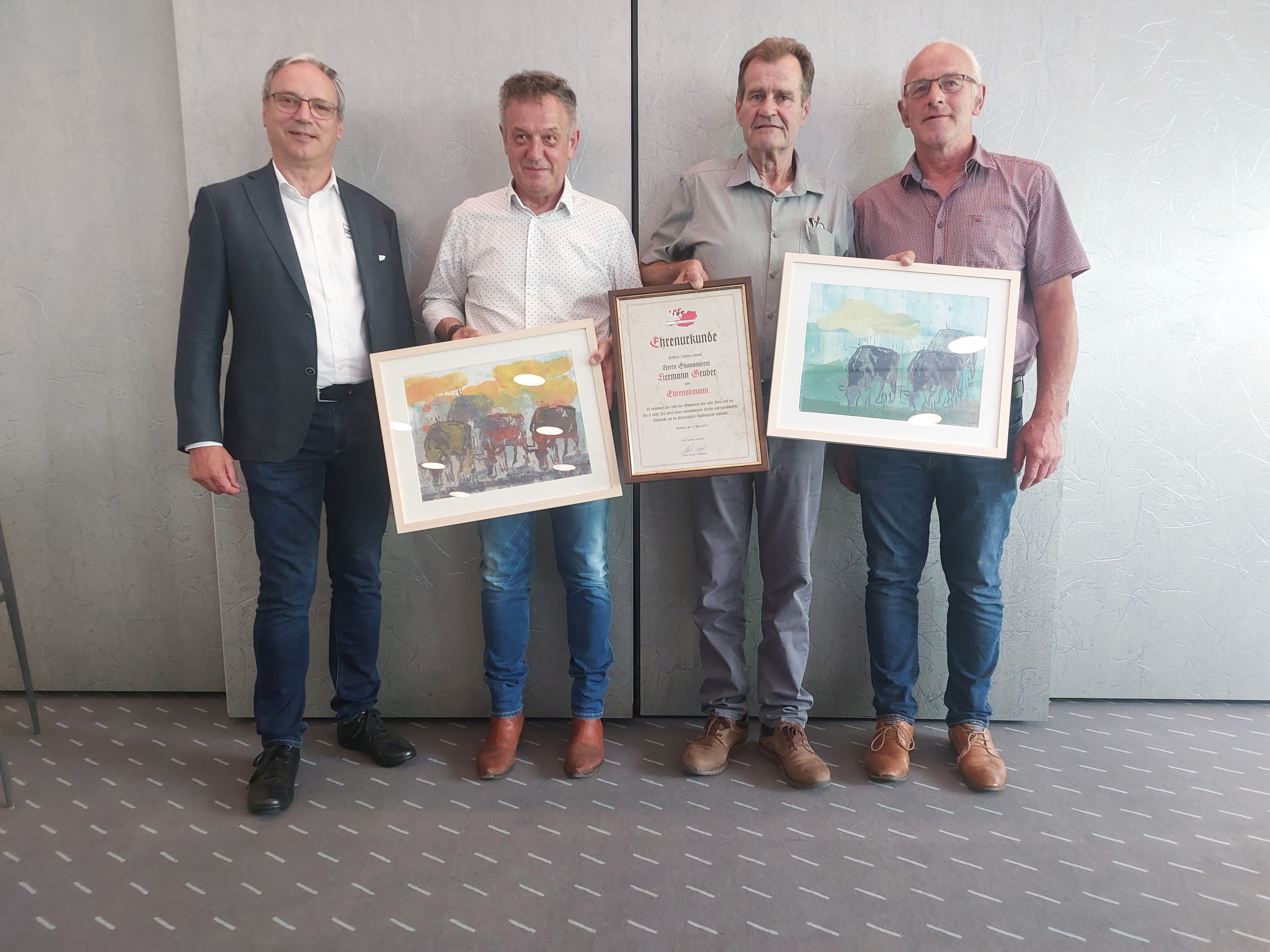 Für ihre großen Verdienste bei Holstein Austria wurden Obmann Hermann Gruber und Geschäftsführer Hans Terler zum Abschied geehrt. Im Bild mit dem neuen Obmann Ulrich Kopf (rechts) und Rinderzucht Austria Obmann Sebastian Auernig (links).