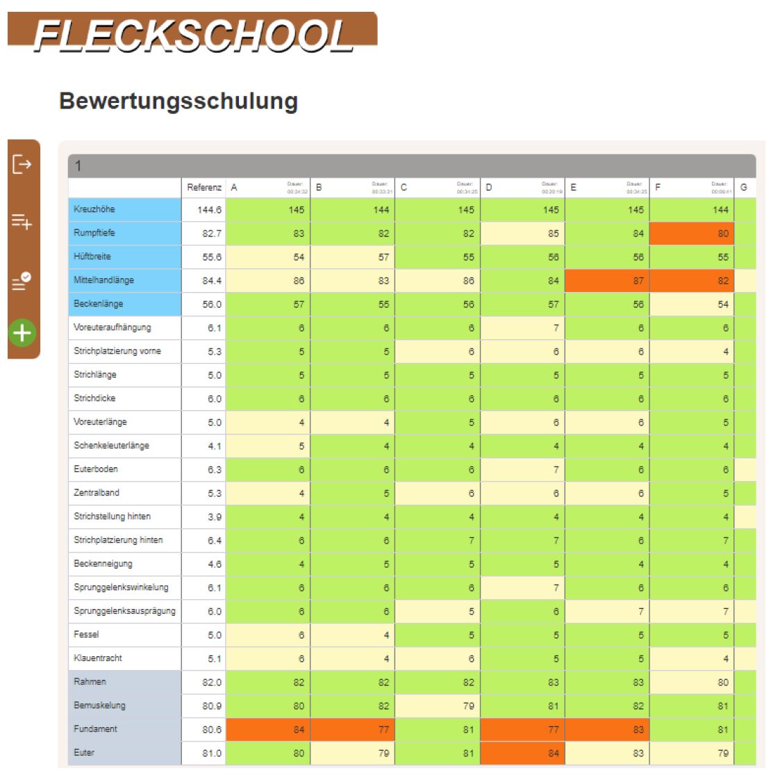 Der nächste Schritt FleckSchool ist ein automatisiertes Auswertungsprogramm für Tierbeurteilungen nach FleckScore und als Online-Anwendung konzipiert. FleckSchool ermöglicht einen Vergleich von Linearen Beschreibungen mit einer vorgegebenen Niveaugabe. Mit seinen umfangreichen Auswertungsmöglichkeiten ist es ein effektives Online-Tool für Schulen und Jungzüchtervereinigungen in der Abhaltung von Tierbeurteilungswettbewerben von Fleckviehkühen und aktuell in den Sprachen Deutsch und Englisch verfügbar.