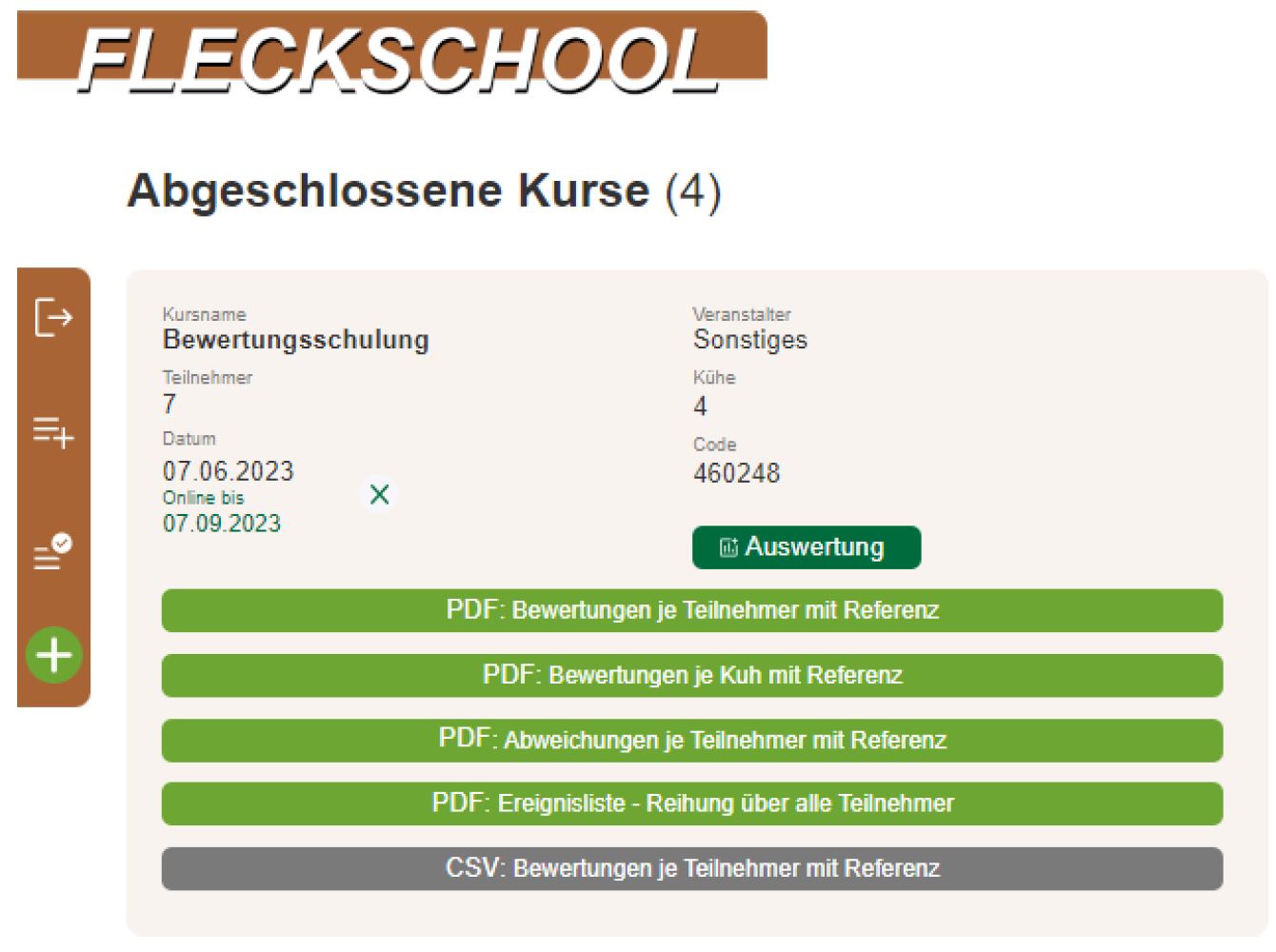 Wenn der Kurs vom Kursleiter beendet wird, werden vom System automatisierte Auswertungen erstellt. Als Ergebnis stehen dem Kursleiter mehrere Auswertungen, die auch als PDF ausdruckbar sind, zur Verfügung: