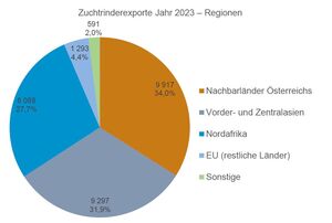 Das Jahr 2023 ist für die heimischen Rinderzüchter:innen aus vermarktungstechnischer Sicht sehr gut verlaufen. Zufriedenstellende Vermarktungspreise, auch aufgrund einer starken Nachfrage nach österreichischen Zuchtrindern, haben die Preise zusätzlich stabilisiert. Aufgrund des starken Interesses wurden im Jahr 2023 29.186 Zuchtrinder exportiert, um 5.300 Stk. oder 22 % mehr als im Vorjahr. Davon wurden 38 % oder 11.220 Tiere innerhalb der Europäischen Union vermarktet, die restlichen 62 % in Drittländer. Italien ist auch im Jahr 2023 das abnehmerstärkste Nachbarland österreichischer Zuchtrinder und ist seit vielen Jahren ein stabiler Abnehmer. Dorthin wurden 6.200 Tiere geliefert. Insgesamt wurden in die österreichischen Nachbarländer 9.917 Tiere geliefert, das sind 34 % aller Rinder. In den vorder- und zentralasiatischen Raum gingen 32 % aller Tiere bzw. 9.300 Stk. Der nordafrikanische Raum wurde mit 8.100 Tieren beliefert, das sind 28 % aller exportierten Tiere.