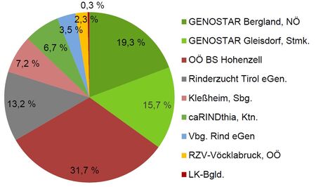 Einen ebenso hohen Österreichanteil weisen die abgesetzten Portionen der Rassen Pinzgauer (99,4 %), Original Pinzgauer (91,1 %), Limousin (85 %) und Charolais (81,8 %) aus. Den höchsten Importanteil verzeichnen Samen der Rassen Jersey (0,3 %), Montbéliarde (6,0 %), Holstein (14,9 %) und Brown Swiss (25,3 %).