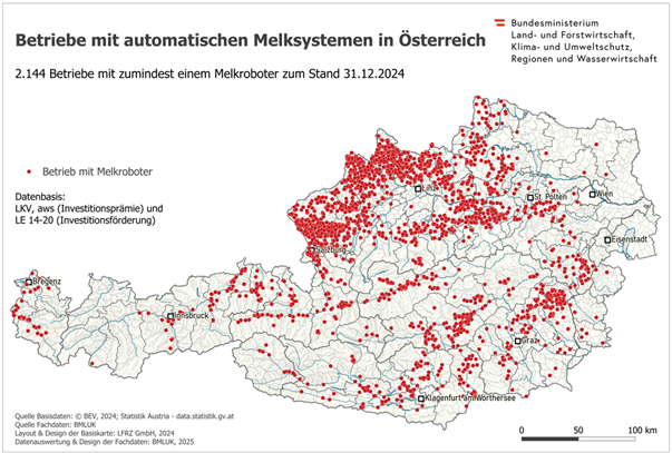 Eine aktuelle Veröffentlichung des BMLUK zeigt anhand österreichweiter Daten per 31.12.2024 bereits 2.144 Betriebe einen oder mehrere Melkroboter im Einsatz haben und im Jahr 2024 Milch angeliefert haben. Neben den Daten der Landeskontrollverbände, hier wurden per 31.12. 2.001 Systeme für das Jahr 2024 im Kuhrier der RINDERZUCHT AUSTRIA Ausgabe 02/2025 veröffentlicht, wurden darüber hinaus auch die Daten von Betrieben, die mit Hilfe der Covid-Investitionsprämie in einen Melkroboter investiert haben sowie die Betriebe, die im Rahmen der Investitionsförderung (LE 14-20) ein automatisches Melksystem gekauft haben, berücksichtigt. Die Systeme nehmen jedes Jahr im Schnitt um rund 20 % zu. Österreichweit wird bereits über ein Viertel der Milch „automatisch“ gemolken (26 %). In Oberösterreich sind es bereits 34 %, in den Bundesländern Steiermark und Burgenland 26 %, in Niederösterreich 25 % in Kärnten 24 %, in Salzburg 23 % sowie in Vorarlberg 10 % bzw. in Tirol 9 %.