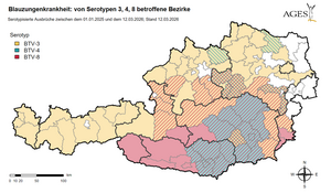 Die Blauzungenkrankheit hat sich im Jahr 2025 in vielen Regionen Österreichs ausgebreitet. Vor allem die Serotypen BTV-3 und BTV-8 wurden nachgewiesen, zusätzlich trat zu Jahresbeginn auch der Serotyp BTV-4 auf. Fachleute gehen davon aus, dass auch in der kommenden Vektorsaison wieder Fälle auftreten werden.
